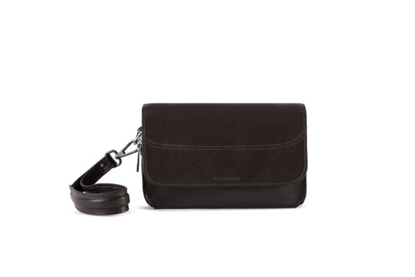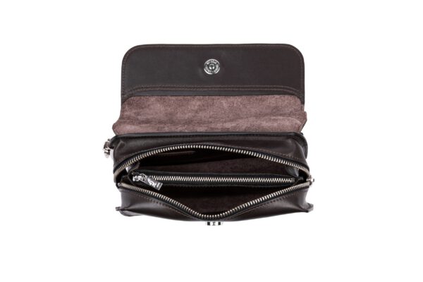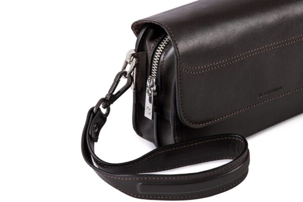 Сумка “Garmoshka” имеет два основных отделения и несколько слотов для карт и мелочей, что помогает держать всё в порядке. Задняя кожаная ручка и петля на запястье обеспечивают удобное и надёжное ношение.