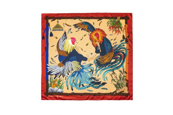 Платок «Qimor» от Black Quail — изысканный аксессуар, выполненный из высококачественного шёлка твил. Лёгкий, мягкий и приятный на ощупь, он станет утончённым акцентом в любом образе. Декорирован авторским принтом с изображением петушиных боёв, выполненным методом высокоточной печати, платок отражает дух динамики и индивидуальности. Его можно носить на шее, завязывать на сумке или использовать как стильный головной аксессуар, добавляя нотку элегантности и уникальности в ваш стиль.